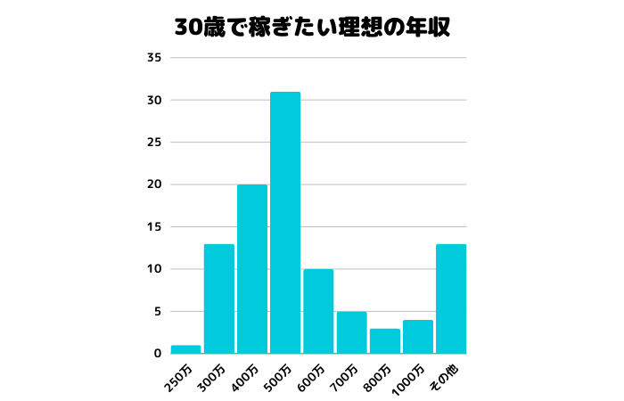 実際、100人に『30歳の理想の年収』のアンケートを取ったところ【年収500万台】と回答したのが31人でした。