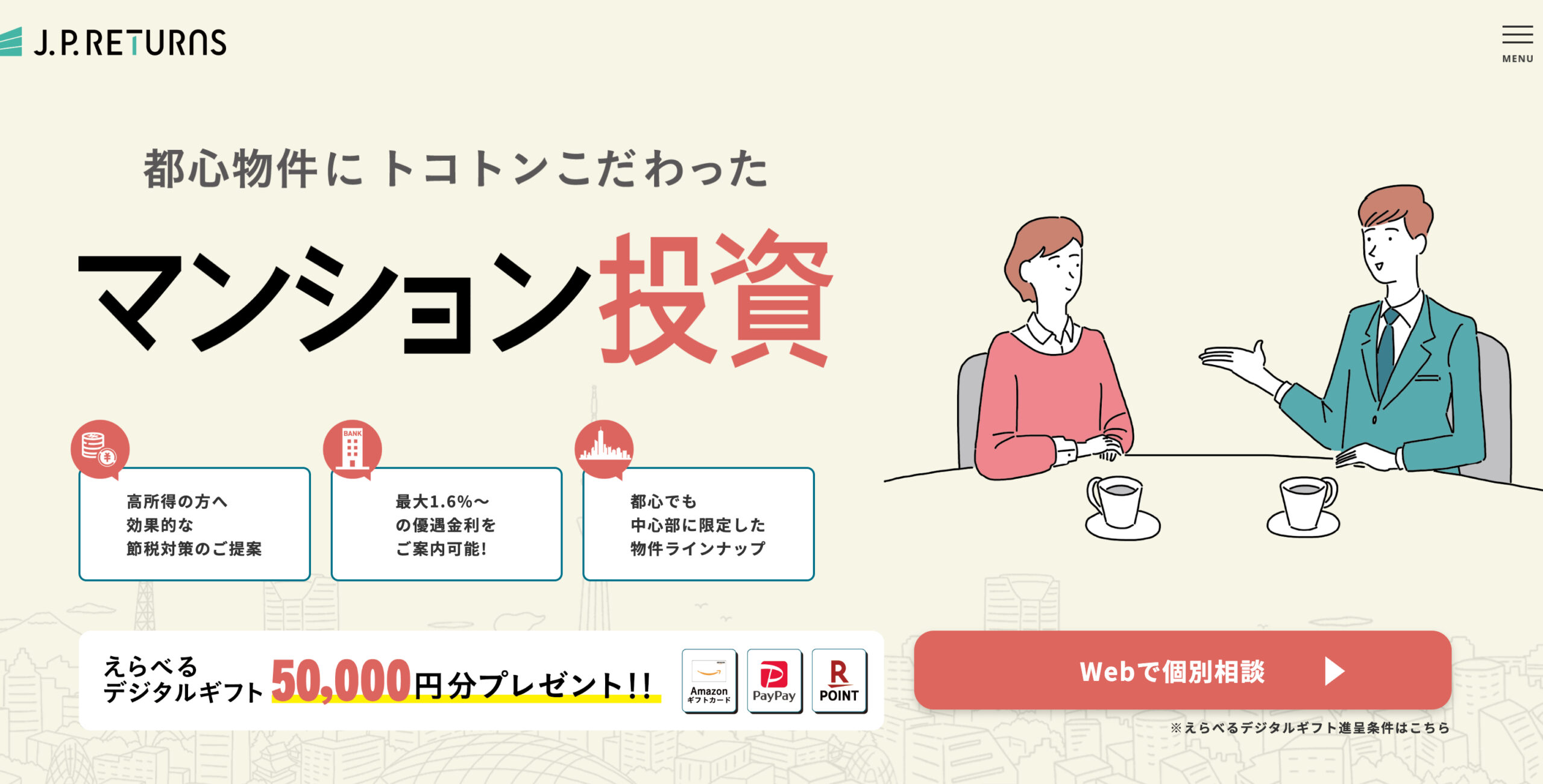 ここでは数ある不動産投資会社の中から「JPリターンズ」をピックアップし、口コミ評判や、メリットデメリット、さらにはJPリターンズに向いている人・いない人、更には同社での投資の始め方など順にご紹介しています。